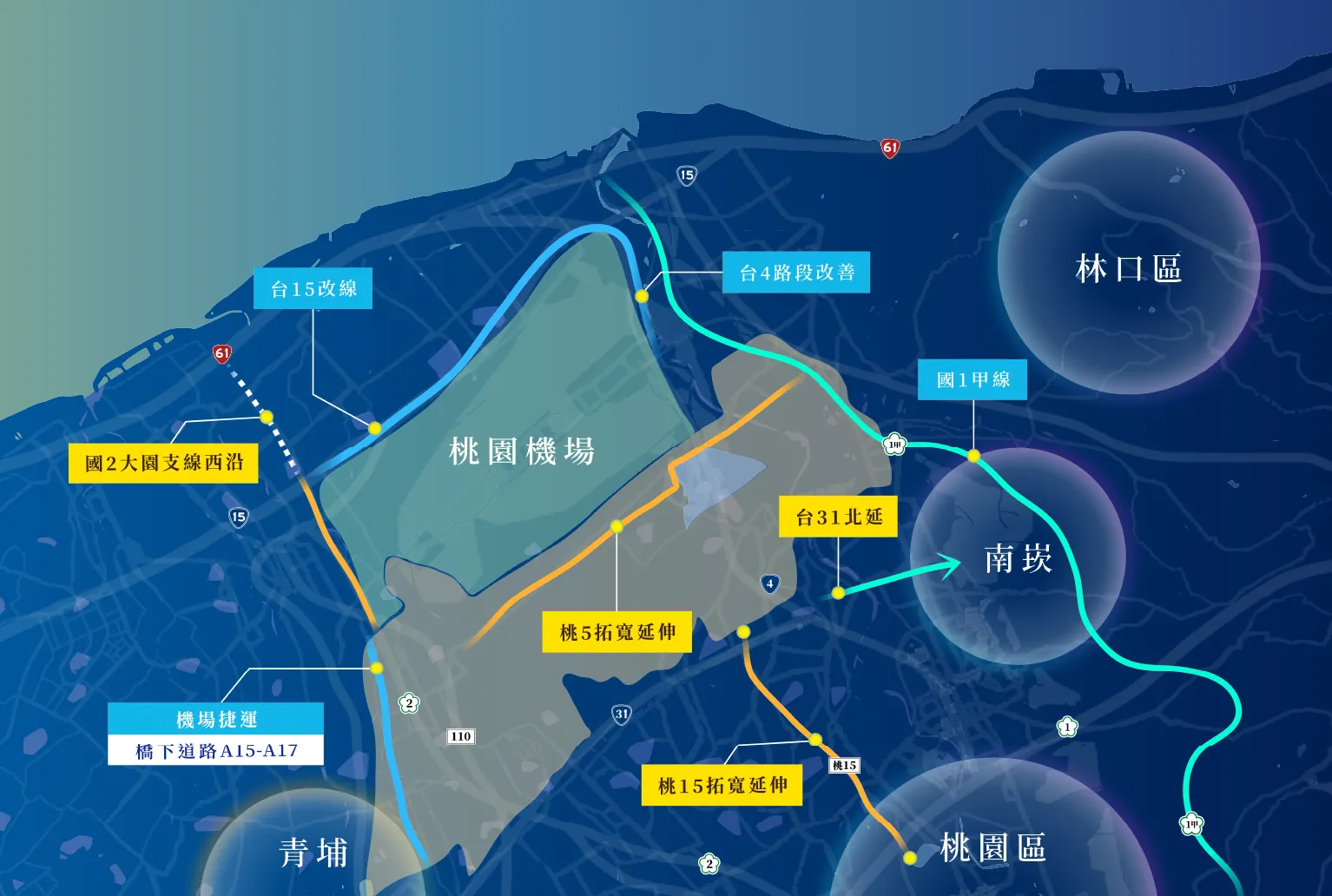 桃園市長張善政,在2024城市發展藍圖交流論壇時表示,航空城計劃在今年明年,已經可以看到,地面上開始長出航空城未來的模樣。全球有無數機場經濟學的成功案例,從早期的歐洲樞紐荷蘭史基輔機場、新加坡樟宜機場、到東北亞轉運樞紐韓國首爾的仁川機場,以及中東現今最重要的轉運樞紐杜拜,都是由單一機場整合周邊自貿港區,導入產業鏈開發,桃園更是全台灣第一的工業科技大城,搶佔AI產業鏈,加上雲端、智能車、綠能、生物科技等符合全球趨勢的規劃,相信能成為帶動台灣經濟發展的下一個火車頭。 More