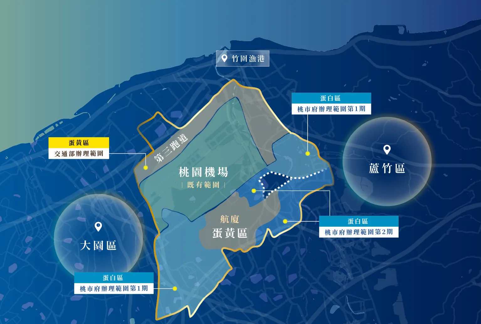 桃園航空城優先產專區劃分9個基地,3年前締造7個基地標售280億元成績,吸引包括星宇航空、統一超商集團投資,但是面積最大的編號I基地(18.94公頃)兩次招標未能決標,市府經發局日前啟動第3次標售公告,開發產業類別除了需符合原來科技業等11項核心產業土管規定,這次標售條件還新增觀光遊憩、體育及商業設施類等3項優先開發項目,期望能創造桃園市就業機會,促進經濟發展。 More